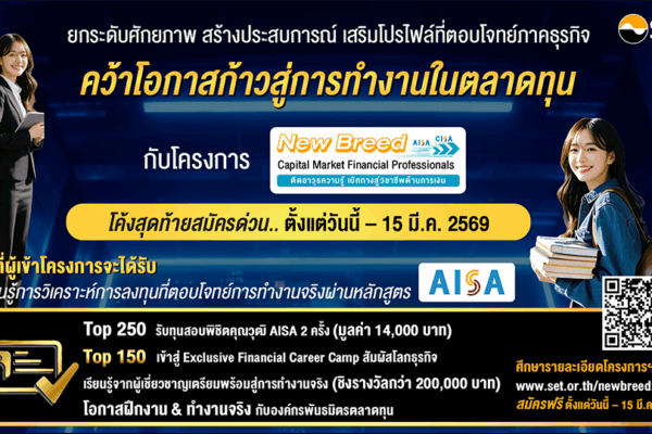 ตลาดหลักทรัพย์แห่งประเทศไทย ชวนนิสิต นักศึกษา และผู้ที่สนใจเริ่มต้นเส้นทางวิชาชีพด้านการเงิน สมัครเข้าร่วม “โครงการทุน New Breed Capital Market Financial Professionals 2026” เพื่อพัฒนาทักษะและความรู้สู่การเป็นบุคลากรคุณภาพในตลาดทุน สิทธิพิเศษที่ผู้เข้าร่วมโครงการจะได้รับ ผู้สนใจ สมัครได้ตั้งแต่วันนี้ – 15 มีนาคม 2569 ไม่มีค่าใช้จ่าย ดูรายละเอียดเพิ่มเติมได้ที่www.set.or.th/newbreed2026