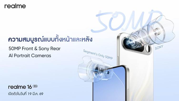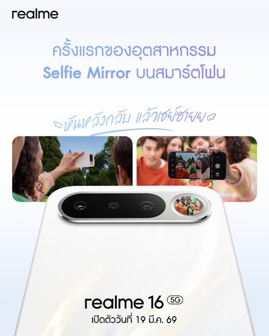 เตรียมสัมผัสความงามของ Aurora Wings Design แบบเต็มตา พร้อมฟีเจอร์ระดับแฟล็กชิปอีกมากมายของ “realme 16 5G” และ realme 16 Pro 5G, realme 16 Pro 5G และผลิตภัณฑ์ IOT อาทิ realme Buds T500 Pro และ realme Pad 3 ในงานเปิดตัวอย่างเป็นทางการ วันที่ 19 มีนาคม 2569 สามารถรับชมการถ่ายทอดสดในทุกแพลตฟอร์มทั้ง Facebook, YouTube และ TikTok ของ realme Thailand ตั้งแต่เวลา 16.00 น. เป็นต้นไป – รอติดตามกันได้เลย
