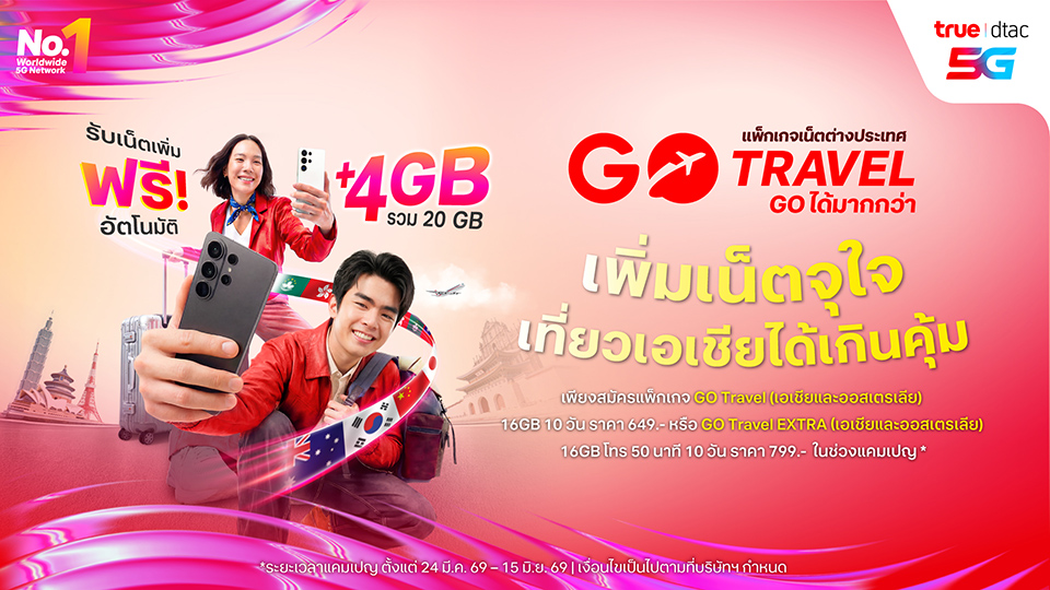 เปิดรับความพิเศษ ซัมเมอร์นี้เพิ่มเน็ตจุใจ เที่ยวเอเชียได้คุ้มยิ่งขึ้น เพียงซื้อแพ็กเกจเน็ตต่างประเทศ GO Travel หรือเริ่มใช้งานซิมเน็ตต่างประเทศ GO Travel SIM สำหรับการเดินทางในโซนทวีปเอเชียและออสเตรเลีย ครอบคลุมกว่า 37 จุดหมายปลายทางยอดนิยม อาทิ จีน, ญี่ปุ่น, สิงคโปร์, ฮ่องกง, ไต้หวัน, เกาหลีใต้, เวียดนาม, ตุรกี (ทูร์เคีย), ซาอุดีอาระเบีย และออสเตรเลีย ตั้งแต่วันนี้ ถึง 15 มิถุนายน 2569 เท่านั้น