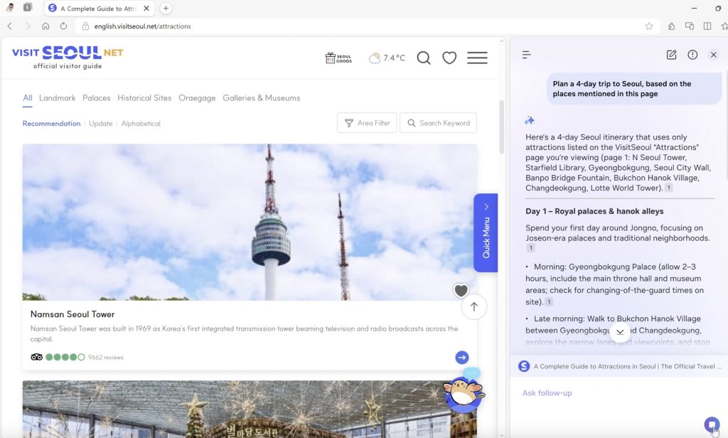 - เข้าใจเนื้อหาอย่างลึกซึ้ง พร้อมตอบสนองแบบครอบคลุม: Samsung Browser ถูกออกแบบให้เข้าใจบริบทเฉพาะเจาะจงของหน้าเว็บไซต์ที่กำลังใช้งาน เพื่อนำเสนอโซลูชันที่เกี่ยวข้องและปรับให้เหมาะสมที่สุด ตัวอย่างเช่น ระหว่างที่วางแผนไปเที่ยวกรุงโซล ผู้ใช้สามารถขอให้ Browser สร้างแผนการเดินทาง 4 วัน โดยอ้างอิงจากหน้าเว็บไซต์ที่กำลังเปิดอยู่ โดย Samsung Browser จะทำการวิเคราะห์เนื้อหาและสร้างแผนงานที่เป็นระบบ ซึ่งสามารถนำไปจัดระเบียบและปรับแต่งในรูปแบบที่ผู้ใช้ต้องการได้อย่างง่ายดาย