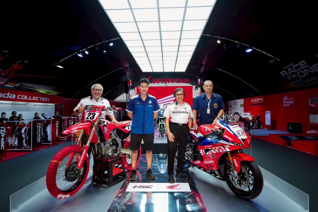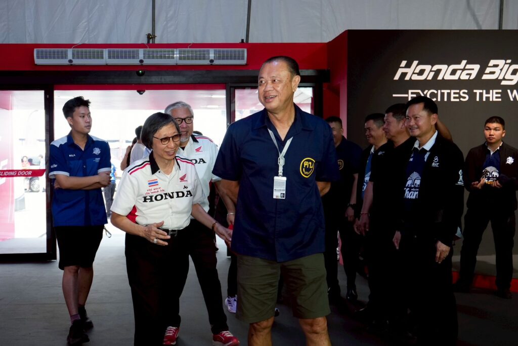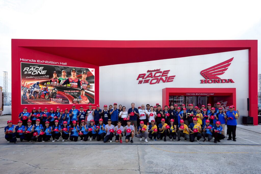 ดร.อารักษ์ พรประภา ประธานบริษัท ไทยฮอนด้า จำกัด ร่วมถ่ายภาพกับ คุณเนวิน ชิดชอบ ประธาน บริษัท บุรีรัมย์ ยูไนเต็ด อินเตอร์เนชั่นแนล เซอร์กิต จำกัด พร้อมคณะปฏิบัติงานจิตอาสาทั้งภาครัฐ และ ตัวแทนพี่น้องประชาชนจิตอาสาชาวบุรีรัมย์ ร่วมกันรับมอบหมวกกว่า 1,200 ใบ บริเวณด้านหน้า Honda Exhibition Hall เพื่อสนับสนุนการปฏิบัติงานอำนวยความสะดวก ดูแลความเรียบร้อย และให้การต้อนรับแฟนมอเตอร์สปอร์ตจากทั้งในและต่างประเทศ ในการจัดงานการแข่งขันทางเรียบชิงแชมป์โลก รายการ “พีที กรังด์ปรีซ์ ออฟ ไทยแลนด์ 2026” ณ สนามช้าง อินเตอร์เนชั่นแนล เซอร์กิต จ.บุรีรัมย์ วันที่ 27 กุมภาพันธ์ – 1 มีนาคมนี้ ที่ประเทศไทยเป็นเจ้าภาพเปิดฤดูกาลสนามแรกที่จังหวัดบุรีรัมย์