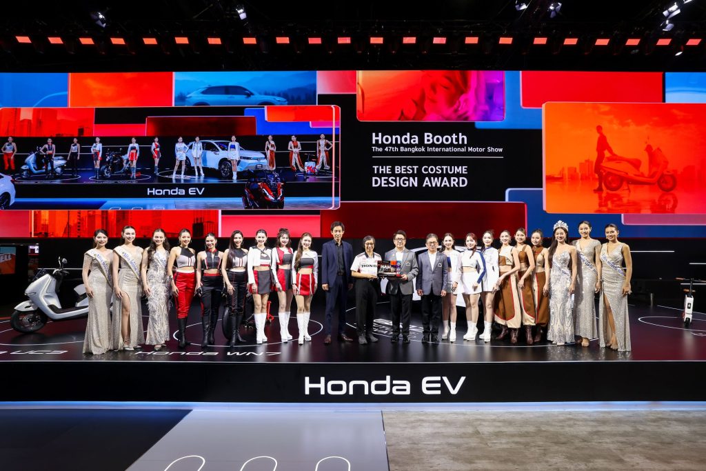 นอกจากนี้ บูธฮอนด้าในงานมอเตอร์โชว์ยังได้รับรางวัล Best Costume Design Award ซึ่งถือเป็นอีกหนึ่งความภาคภูมิใจที่สะท้อนถึงความมุ่งมั่นของฮอนด้าในการให้ความสำคัญกับงานดีไซน์อย่างรอบด้าน โดยไม่ได้หยุดอยู่เพียงแค่การออกแบบนวัตกรรมบนตัวรถเท่านั้น แต่ยังครอบคลุมไปถึงการสร้างสรรค์ภาพลักษณ์ที่ประณีตและสื่อสารเอกลักษณ์ของแบรนด์ผ่านเครื่องแต่งกาย เพื่อส่งมอบประสบการณ์ที่สมบูรณ์แบบในทุกมิติของการจัดแสดง โดยมีการออกแบบเครื่องแต่งกายของ Honda Lady ให้เชื่อมโยงกับแนวคิด “Activating Life’s Next Move” ได้อย่างลงตัวใน 4 โซนหลัก ไม่ว่าจะเป็น Smart Life ที่สื่อถึงโลกอนาคตและเทคโนโลยี EV ด้วยสีขาวน้ำเงินและวัสดุเงางามล้ำสมัย Urban Life สะท้อนไลฟ์สไตล์คนเมืองผ่านชุดที่ปรับเปลี่ยนลุคได้อย่างคล่องตัวตามกิจกรรมที่ทำ Life Passion เน้นความสปอร์ตในโทนสีแดงดำ และ Life Explorer ที่สะท้อนจิตวิญญาณนักเดินทางด้วยดีไซน์ที่คล่องตัวในโทนสีน้ำตาล