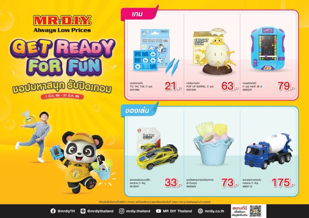 มิสเตอร์. ดี.ไอ.วาย. ผู้นำธุรกิจค้าปลีกอุปกรณ์ตกแต่งบ้านและสินค้าไลฟ์สไตล์ เดินหน้าเสิร์ฟความสุขสุดคุ้มทั่วไทยกับโปรโมชัน “GET READY FOR FUN ชอปมหาสนุก รับปิดเทอม”(1) คัดสรรของเล่นเสริมพัฒนาการเด็ก และไอเทมสำหรับกิจกรรมสุดสร้างสรรค์ เพื่อเติมเต็มช่วงเวลาแห่งความสุขในครอบครัว กับสินค้าในราคาถูกคุ้มเสมอ (Always Low Prices) ณ ร้านมิสเตอร์. ดี.ไอ.วาย. กว่า 1,100 สาขาที่ร่วมรายการ(2) ตั้งแต่วันที่ 1 มีนาคม พ.ศ. 2569 – 31 มีนาคม พ.ศ. 2569