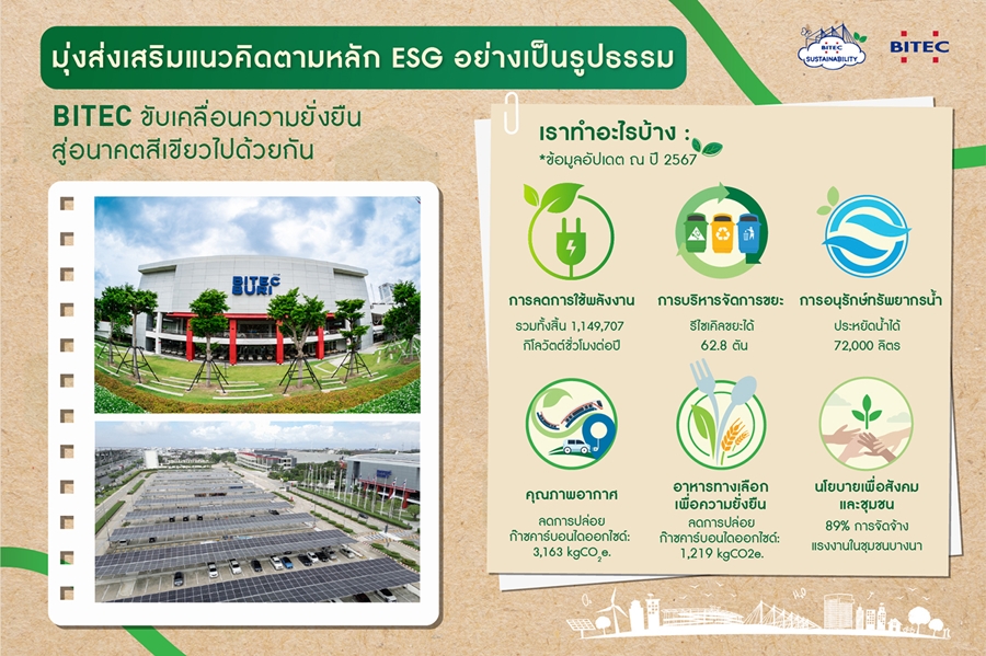 ไบเทคพร้อมเปิดพื้นที่ให้ผู้จัดงานและองค์กรต่างๆ เข้าร่วมเป็นส่วนหนึ่งของการขับเคลื่อนอุตสาหกรรมไมซ์ไทยสู่ความยั่งยืนด้วยการมอบเครื่องมือและบริการต่าง ๆ แก่ผู้จัดงานโดยผู้จัดงานจะได้รับบริการการติดตามคาร์บอนแบบเรียลไทม์การบูรณาการการออฟเซ็ตในการวางแผนงานกิจกรรมการให้คำปรึกษาด้านการออกแบบงานกิจกรรมที่เป็นมิตรต่อสิ่งแวดล้อมและการให้การรับรองในฐานะผู้จัดงานที่ยั่งยืน ภายใต้แนวคิด “จัดงานให้ยั่งยืนเริ่มต้นได้จริงที่ไบเทค” สามารถติดตามโครงการดี ๆ ของศูนย์นิทรรศการและการประชุมไบเทค ได้ที่ Sustainability – Bangkok International Trade& Exhibition Centre หรือ www.bitec.co.th/visitor/sustainability