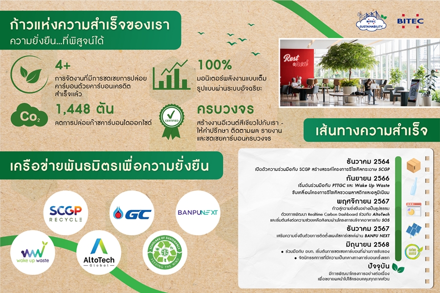 ไบเทคตอกย้ำความเป็นผู้นำด้านความยั่งยืนในอุตสาหกรรมไมซ์ไทยด้วยการผนึกกำลัง 6 พันธมิตรชั้นนำ ได้แก่ SCGP, GC, Wake UpWaste, AltoTech, Banpu NEXT และ Scholars of Sustenance(SOS) ร่วมพัฒนาโมเดลการจัดงานที่ลดการปล่อยก๊าซคาร์บอนไดออกไซด์ครอบคลุมการวัด ลด และชดเชยคาร์บอน พร้อมนำเทคโนโลยี RealTime CarbonTracking Dashboard และมาตรฐานการชดเชยคาร์บอนขององค์การบริหารจัดการก๊าซเรือนกระจก (องค์การมหาชน) หรือ TGO มาใช้จริงผลักดันงานอีเวนต์ไทยสู่ Carbon-Neutral Events ตอบโจทย์เทรนด์โลกที่ให้ความสำคัญกับสิ่งแวดล้อม