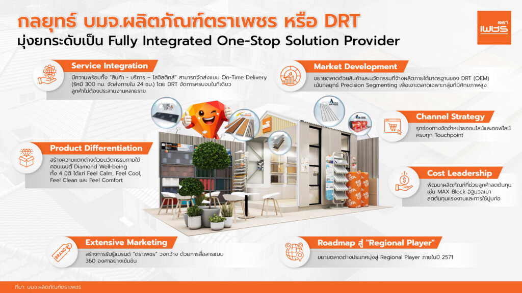 1) Service Integration โดยมีครบทั้ง “สินค้า- บริการ – การจัดส่ง” อาทิ กระเบื้องหลังคาไฟเบอร์ซีเมนต์, กระเบื้องหลังคาคอนกรีต, ไม้สังเคราะห์, อิฐมวลเบา, โครงหลังคาสำเร็จรูป, พื้น SPC, บริการติดตั้งหลังคา, พื้น SPC, เปลี่ยนและทาสีหลังคา ตลอดจนการจัดส่งสินค้าแบบ On-Time Delivery (รัศมี 300 กม. ส่งถึงภายใน 24 ชม.) โดยลูกค้าไม่ต้องประสานงานกับซัพพลายเออร์หลายราย 2) Market Development การขยายตลาดด้วยการจ้างผลิตสินค้า (OEM) ภายใต้มาตรฐานของ DRT และมุ่งเจาะตลาดเฉพาะกลุ่มผ่านกลยุทธ์ Precision Segmenting เช่น หลังคายูพีวีซี สำหรับฟาร์มและงานต่อเติม, ไม้สังเคราะห์ WPC เอ็กซ์ทรูชิลด์ และหลังคาเหล็กเคลือบผิวด้วยหินธรรมชาติ สำหรับโรงแรมและรีสอร์ท 3) Product Differentiation สร้างความแตกต่างด้วยสินค้านวัตกรรม “Diamond Well-being” ภายใต้แนวคิด “บ้านที่ดีไม่ใช่แค่แข็งแรงและสวยงาม แต่ต้องดูแลสุขภาพของคนในบ้าน” ที่ตอบโจทย์ 4 มิติ ได้แก่ Feel Calm ลดเสียงรบกวน, Feel Cool ลดความร้อนสะสม, Feel Clean ป้องกันความชื้น และ Feel Comfort ทนทาน ลดค่าบำรุงรักษา