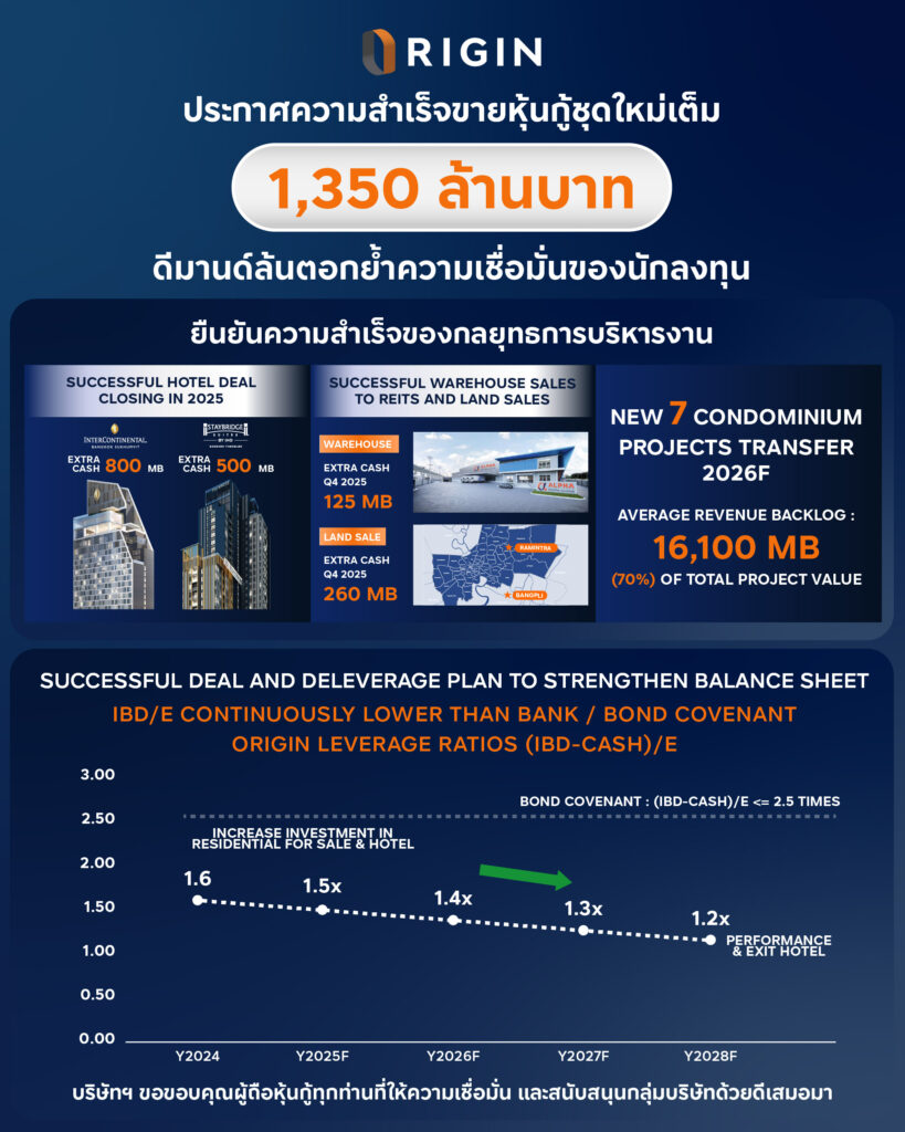 ออริจิ้น พร็อพเพอร์ตี้ ประกาศความสำเร็จขายหุ้นกู้ชุดใหม่ครั้งที่ 1/2569 ตามเป้าหมาย นักลงทุนจองซื้อทะลุเต็มจำนวน 1,350 ล้านบาท ตอกย้ำความเชื่อมั่นในธุรกิจ