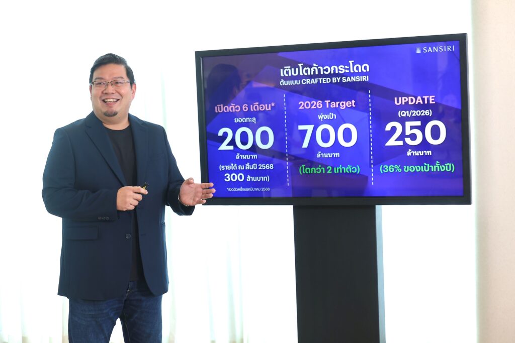 ต้นแบบ Crafted by Sansiri เปิดตัวเมื่อเดือนมีนาคม 2568 เพื่อปิด Pain Point ของตลาดรับสร้างบ้าน ด้วยความแข็งแกร่งของ One Stop Service Solution เริ่มจากการดีไซน์ การผลิต การจัดส่ง การก่อสร้าง ที่เราถอดรหัสความสำเร็จมาจากโครงการของแสนสิริมาไว้บนที่ดินส่วนตัวของลูกค้า เราเป็นรายเดียวที่มีบ้านตัวอย่างจริงให้ลูกค้าดูมากกว่า 18 ซีรีส์ กว่า 100 แบบบ้าน เพื่อสร้างความมั่นใจก่อนตัดสินใจ และใช้ระบบพรีคาสท์ที่ควบคุมทั้งคุณภาพและเวลาได้แม่นยำ ซึ่งเป็นหัวใจสำคัญที่ทำให้เรากวาดรายได้ 200 ล้านบาทหลังจากเปิดตัวเพียง 6 เดือน และปิดปี 2568 ด้วยยอดขาย 300 ล้านบาท
