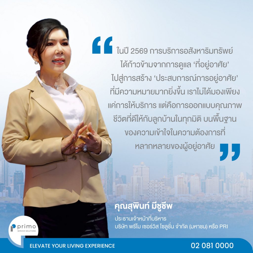นางสุพินท์ มีชูชีพ ประธานเจ้าหน้าที่บริหาร บริษัท พรีโม เซอร์วิส โซลูชั่น จำกัด (มหาชน) หรือ PRI ผู้นำธุรกิจการให้บริการเกี่ยวเนื่องกับอสังหาริมทรัพย์สมัยใหม่แบบครบวงจร เปิดเผยถึงทิศทางการบริหารอสังหาริมทรัพย์ในปัจจุบันได้เปลี่ยนผ่านสู่การให้ความสำคัญกับ “ประสบการณ์การอยู่อาศัย” และ “คุณภาพชีวิต” ของลูกบ้านเป็นหัวใจหลัก โดยผู้ให้บริการต้องเข้าใจความต้องการที่หลากหลายของผู้อยู่อาศัยในแต่ละกลุ่ม พร้อมพัฒนาโครงการให้เป็นมากกว่าที่อยู่อาศัย แต่เป็น “คอมมูนิตี้คุณภาพ” ที่ตอบโจทย์ไลฟ์สไตล์ ควบคู่กับการดำเนินงานอย่างยั่งยืนตามแนวคิด ESG เพื่อสร้างคุณค่าในระยะยาวทั้งต่อผู้อยู่อาศัยและธุรกิจ