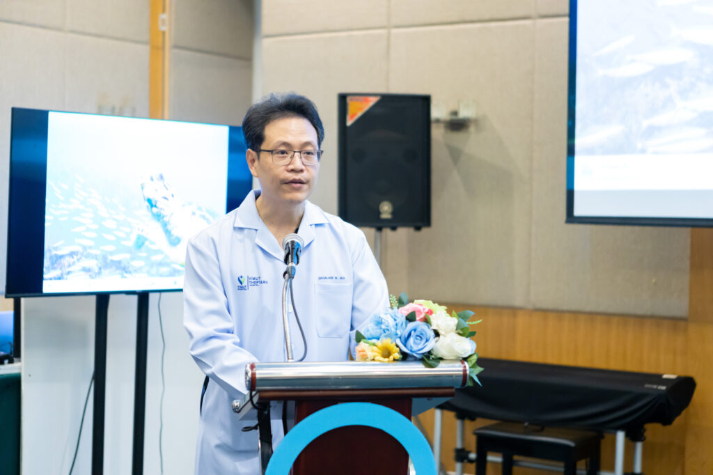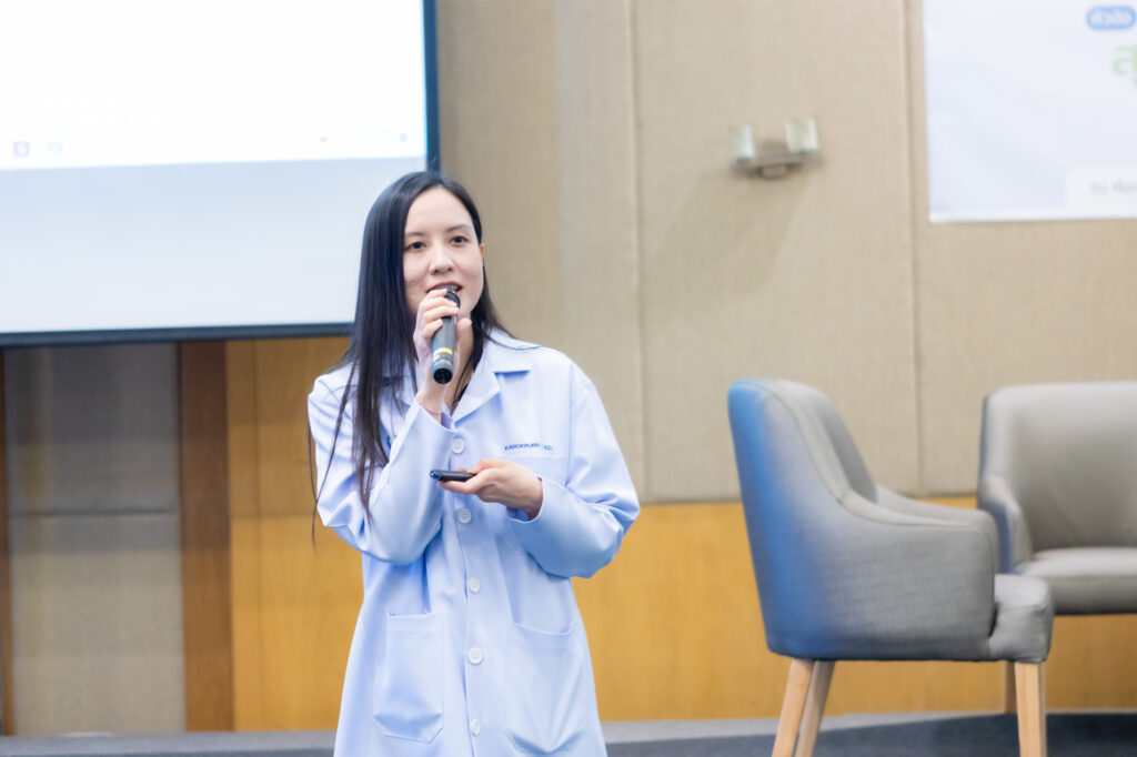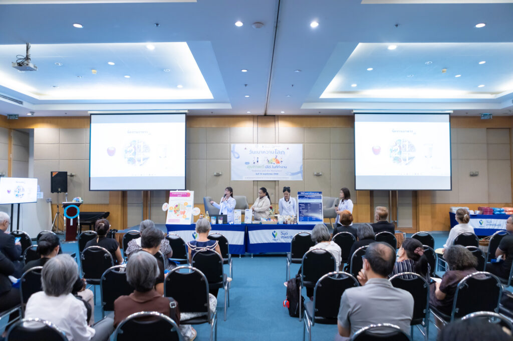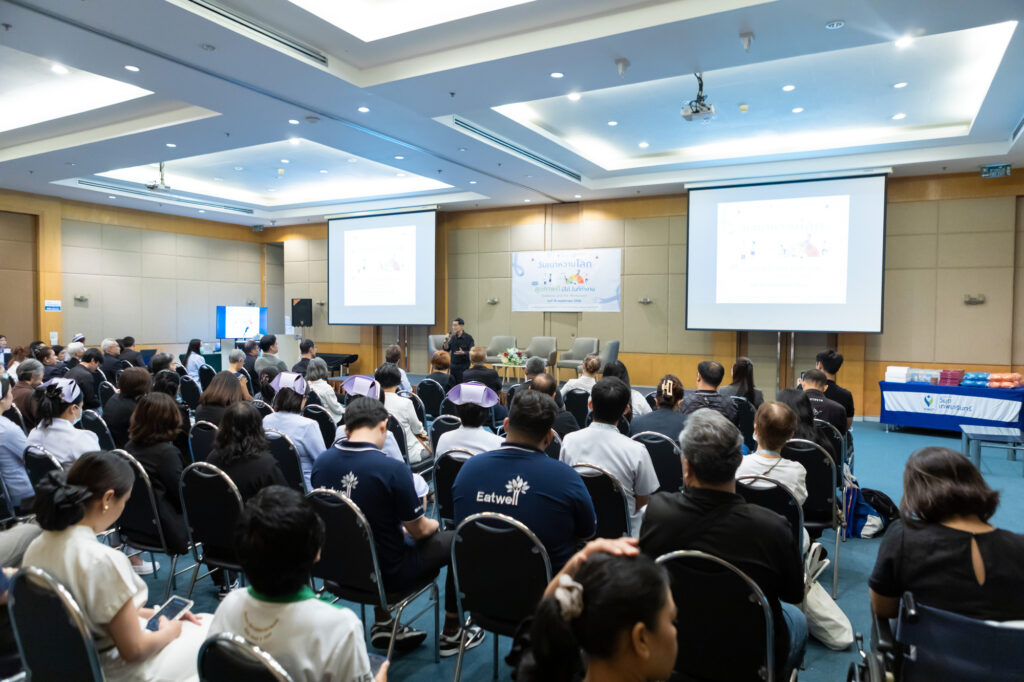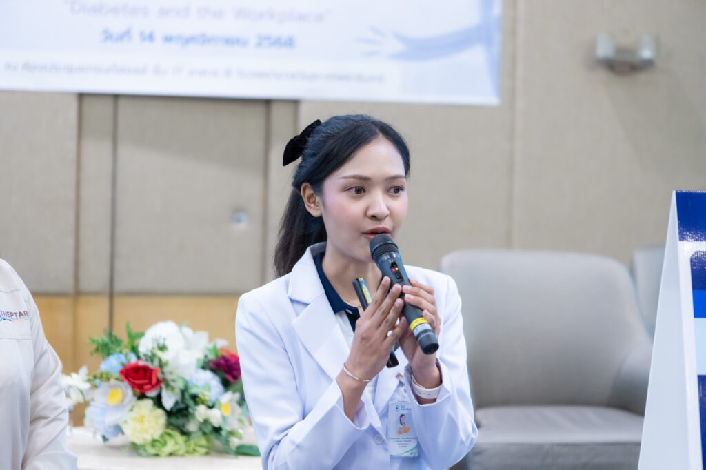 หนึ่งในกิจกรรมที่น่าสนใจ คือ ช่วงเสวนา “สุขภาพดี มีได้…ในที่ทำงาน” นำโดย แพทย์ผู้เชี่ยวชาญ นพ.เอกลักษณ์ วโนทยาโรจน์ อายุรแพทย์ต่อมไร้ท่อ และผู้อำนวยการศูนย์เบาหวาน ไทรอยด์ และต่อมไร้ท่อเทพธารินทร์ ที่มาอัปเดตสถานการณ์โรคเบาหวานปัจจุบันที่น่าเป็นห่วงอย่างยิ่ง เพราะเป็นโรคในกลุ่ม NCDs ที่เพิ่มขึ้นเร็ว ในทุก ๆ 5 ปี จะมีผู้ป่วยเพิ่ม 1 ล้านคน หรือ ในทุก 9 คน จะเป็นเบาหวาน 1 คน นอกจากนี้ โรคเบาหวานยังเริ่มคุกคามคนวัยทำงานมากขึ้น อายุเฉลี่ยผู้ที่ป่วยลดลงจาก 50 ปี เป็น 40 ปี และเริ่มพบในวัย 30 ปีมากขึ้น โดยกลุ่มวัยทำงานมักมีภาวะแทรกซ้อนสูงกว่ากลุ่มอื่น ดังนั้น “คนวัยทำงานจำเป็นต้องใส่ใจสุขภาพอย่างจริงจังและต่อเนื่อง”