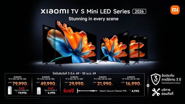 ทีวีอัจฉริยะ Xiaomi TV S Mini LED 2026 มีขนาดหน้าจอให้เลือก 5 ขนาด ได้แก่ 55 นิ้ว, 65 นิ้ว, 75 นิ้ว, 85 นิ้ว และ 98 นิ้ว โดยขนาด 55 นิ้ว วางจำหน่ายในราคาเริ่มต้นที่ 16,990 บาท พิเศษ! ลูกค้าที่ซื้อสินค้าตั้งแต่วันนี้ ถึง 30 เมษายน 2569 รับฟรี Xiaomi Vacuum Cleaner P30 มูลค่า 4,990 บาท2ที่ Xiaomi Store และร้านตัวแทนจำหน่ายที่ร่วมรายการทั่วประเทศ รวมถึงช่องทางการจัดจำหน่ายทางออนไลน์แพลตฟอร์ม mi.comและ Lazada2
