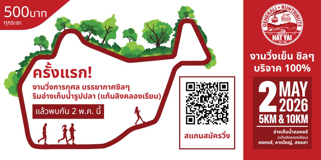 สำหรับกิจกรรม “GENERALI RUNTRIBUTE: REBUILD HAT YAI” จัดขึ้นในวันที่ 2 พฤษภาคม 2569 ตั้งแต่เวลา 14.00 – 20.00 น. ณ อ่างเก็บน้ำคอหงส์ (แก้มลิงคลองเรียน) เทศบาลเมืองคอหงส์ อำเภอหาดใหญ่ จังหวัดสงขลา โดยแบ่งรูปแบบการวิ่งออกเป็น Mini Marathon ระยะทาง 10 กิโลเมตร และ Fun Run ระยะทาง 5 กิโลเมตร ค่าสมัครเพียง 500 บาท ทุกระยะทาง พร้อมร่วมวิ่งไปกับ “วีเจจ๋า” ณัฐฐาวีรนุช ทองมี ที่จะมาร่วมสร้างสีสันและแรงบันดาลใจตลอดเส้นทาง