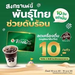 - โปรโมชันมอบส่วนลดพิเศษให้ชาวบัตรเขียว (Max Card Premier) รับส่วนลดทันที 10 บาท/แก้ว ทุกเมนู ทั้งร้อน เย็น และปั่น ตั้งแต่วันที่ 10 เม.ย. 69 – 19 เม.ย. 69 จำกัด 2 สิทธิ์ / สมาชิก ตลอดแคมเปญ ที่ร้านพันธุ์ไทยทุกสาขาที่ร่วมรายการ (ยกเว้นสาขาท่าอากาศยาน และเดลิเวอรี)